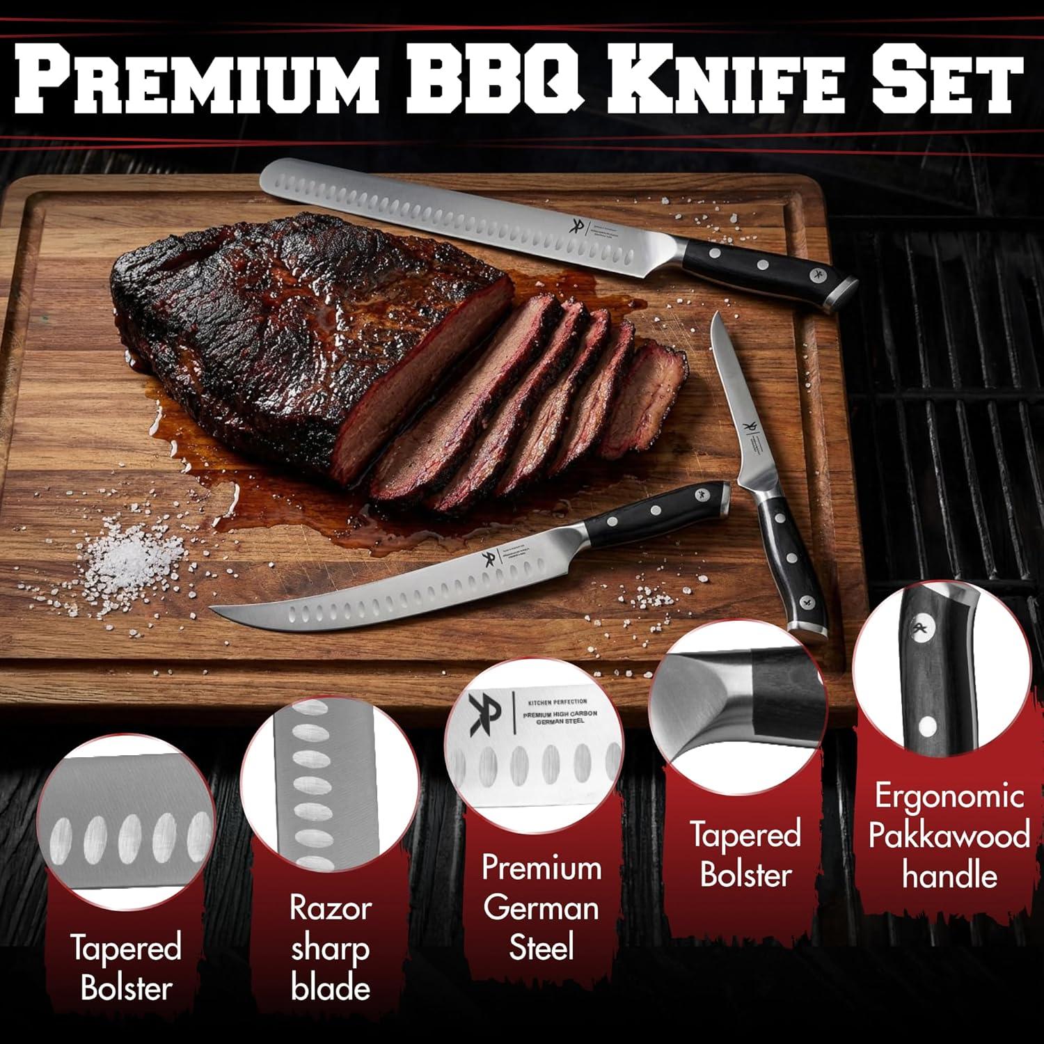 RAZOR-SHARP BLADES WITH COMFORT HANDLES – Each knife features a hand-sharpened, tapered blade: the 12” brisket knife and the 10” butcher breaking knife come with a Granton edge for smooth slicing and carving, and 6” boning knife for clean, precise cuts – perfect for deboning, filleting, skinning, and trimming. Full tang ergonomic pakkawood handles are contoured for a secure, comfortable grip – even during greasy, fast-paced prep.