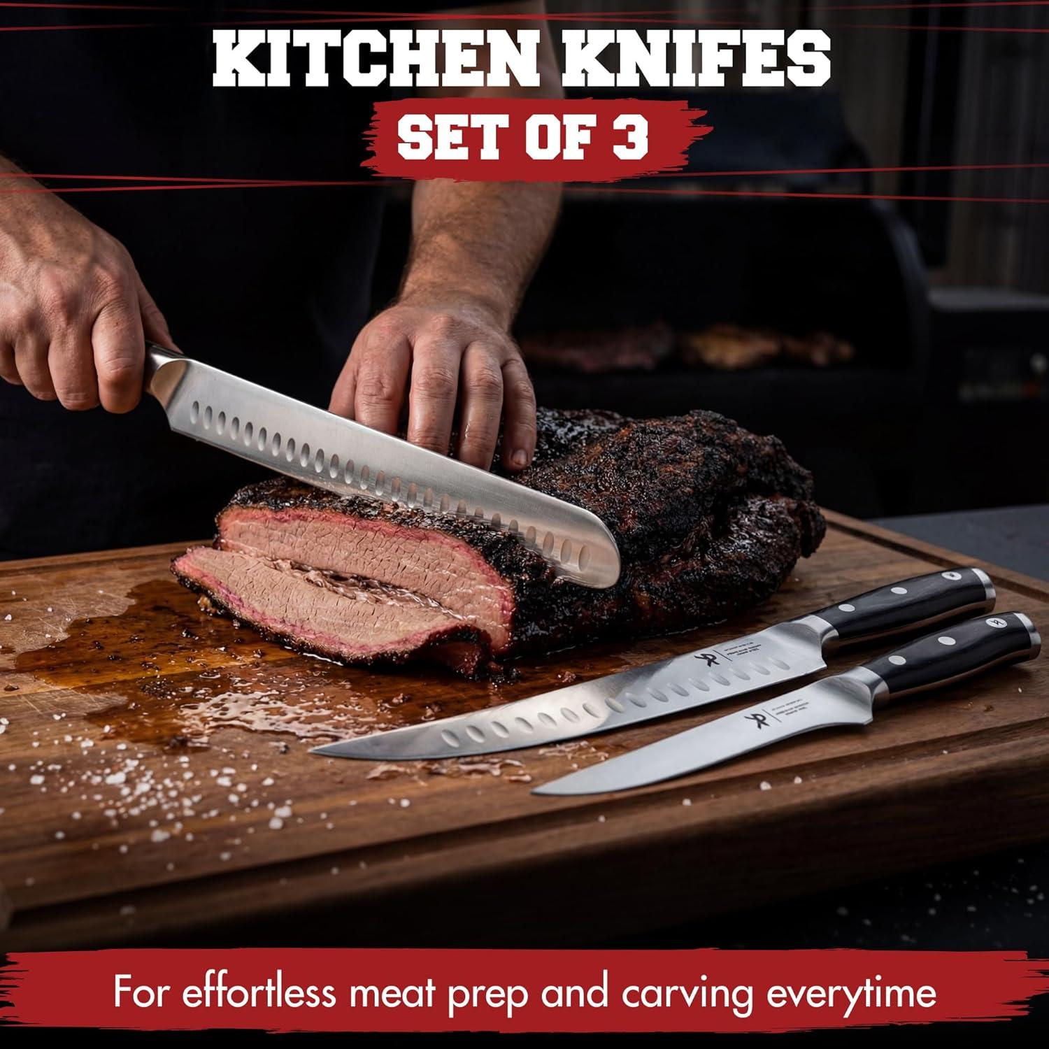 THE COMPLETE MEAT MASTER SET – Includes a 12” brisket knife, 10” butcher breaking knife, and 6” boning knife – precision-crafted to handle every BBQ task: slicing brisket, breaking down roasts, trimming fat, and deboning with ease.