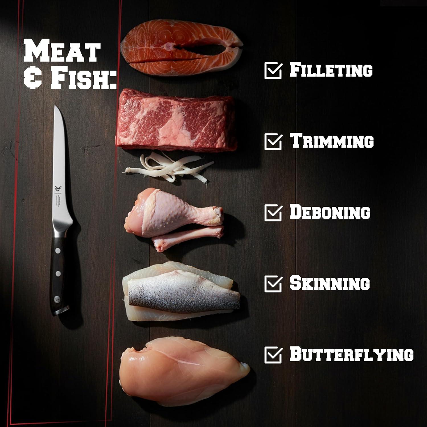 BUILT FOR PRECISION MEAT PREP – Master every cut with this 6” boning knife, Tapered from spine to edge, this blade delivers precision cuts with minimal resistance – perfect for deboning, filleting, skinning, and trimming large or delicate meats. Razor-sharp and perfectly balanced. Perfect for meat, poultry, ribs, or fish.