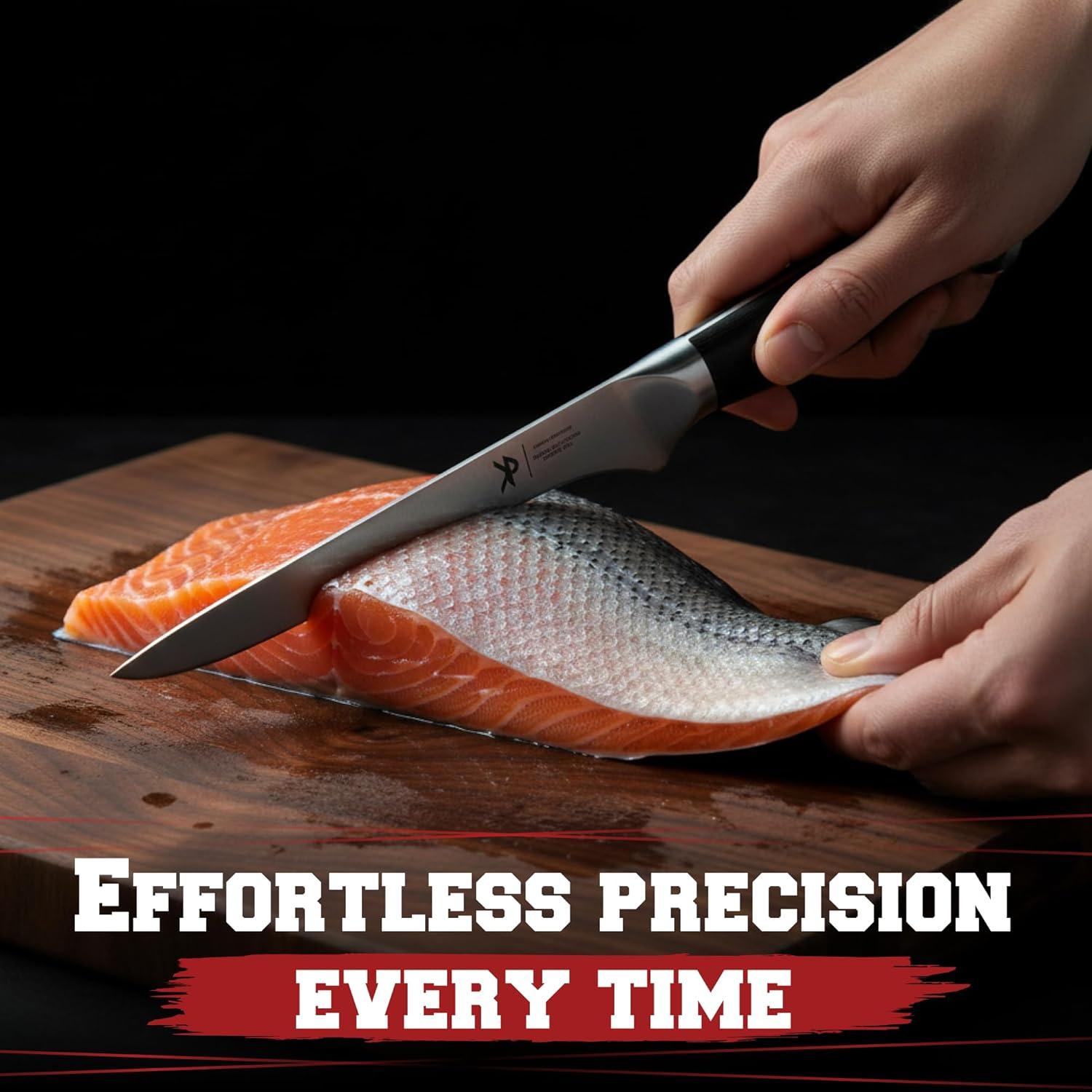 RAZOR-SHARP & ENGINEERED FOR CONTROL – Hand-sharpened to a 14-16° angle per side, the tapered blade slices cleanly through meat and fish with surgical precision. Combined with a triple-riveted, ergonomic pakkawood handle, that fits perfectly in your palm -it delivers comfort, grip, and pro-level control, even in high-speed prep.