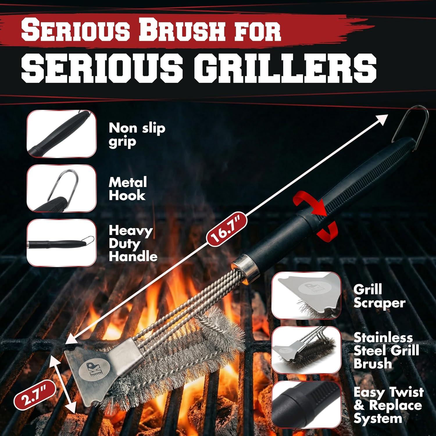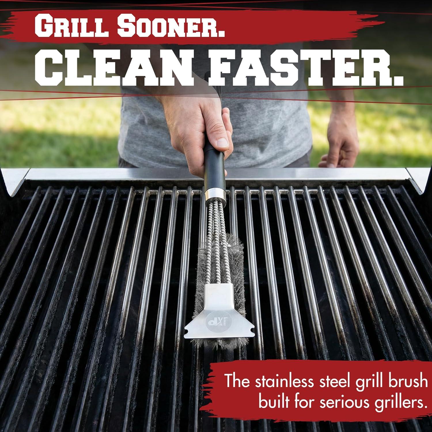 BUILT TOUGH FOR GRILL MASTERS – From the rugged non-slip handle to the high-strength scraper and rust-proof wire bristles, this brush is built to last season after season. At 17 inches long, it gives you max leverage while keeping your hands safely away from the heat.