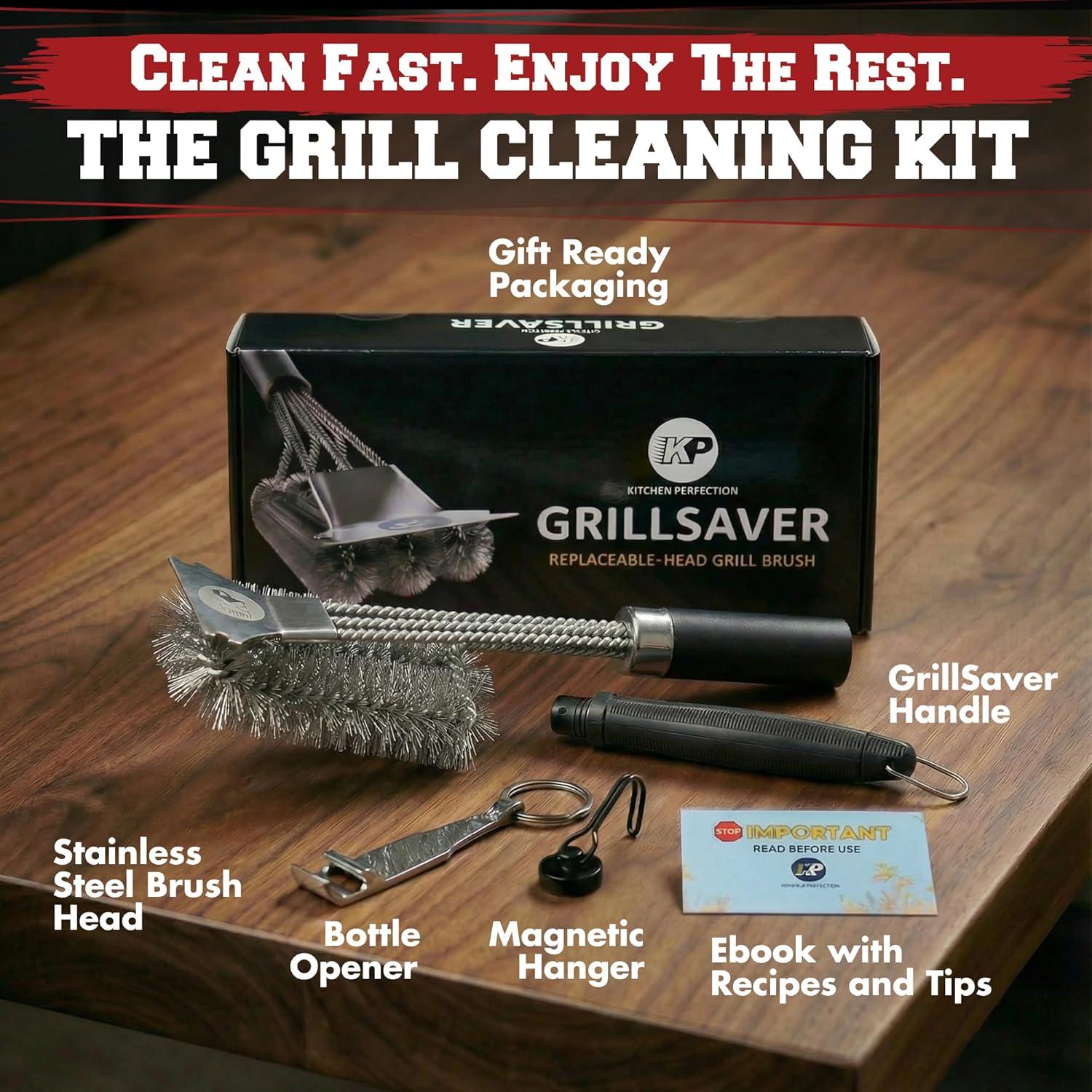 KITCHEN PERFECTION Brass GrillSaver - Safe BBQ Grill Brush with Replaceable Cleaning Head -Heavy-Duty Grill Cleaner w/Scraper for Porcelain & Ceramic Grates, Includes Magnetic Hanger & Bottle Opener(1. Grillsaver - Stainless Steel)