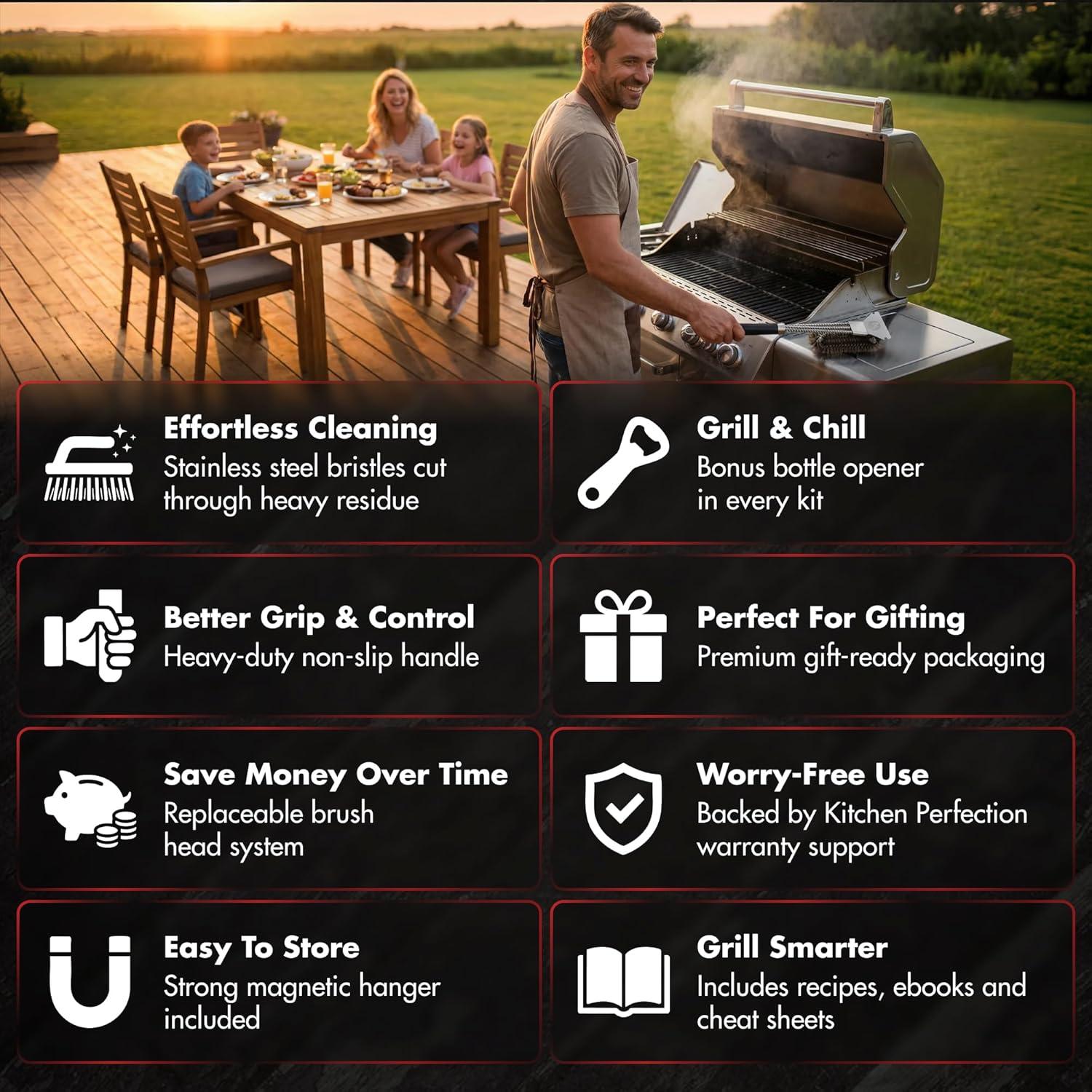 LOADED WITH 6 BONUSES – PERFECT GIFT FOR GRILL MASTERS – GrillSaver isn't just a tool – it’s the ultimate grilling upgrade. Every brush comes with a magnetic hanger for easy storage, a beer bottle opener, two exclusive recipe eBooks (“Great Food from the Grill” + “Healthy Salads”), a meat temperature guide, and a smoking cheat sheet to level up every BBQ. This is an all-in-one gift for any grill enthusiast. Perfect for Father’s Day, birthdays, holidays, or any backyard chef who loves outdoor cooking.
